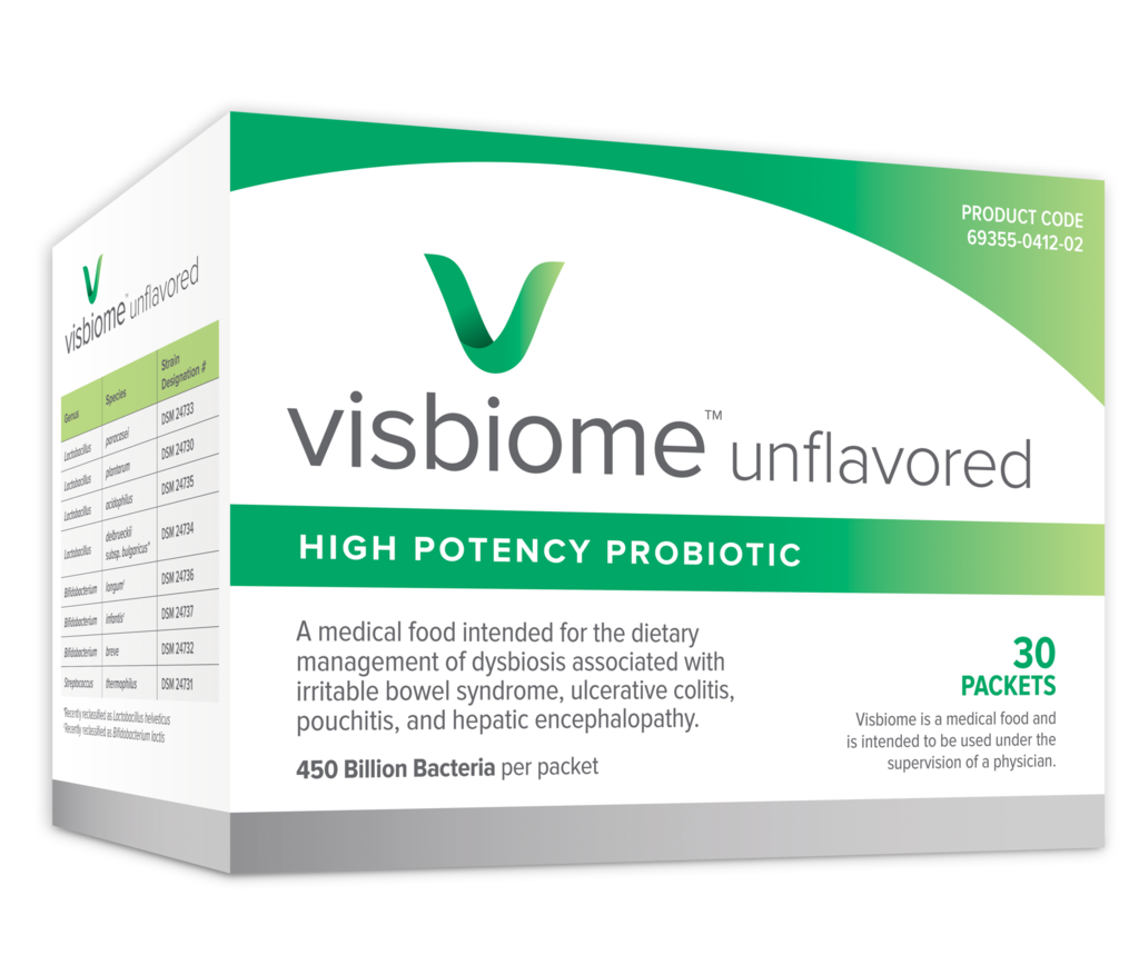 Visbiome® is a specially formulated probiotic medical food intended for the dietary management of dysbiosis associated with IBS, ulcerative colitis, pouchitis, and hepatic encephalopathy. Visbiome is a non-drug therapy that addresses distinct nutritional requirements, to promote microbial balance in people with IBS, ulcerative colitis, pouchitis, and hepatic encephalopathy that cannot be addressed by modification of the diet alone.